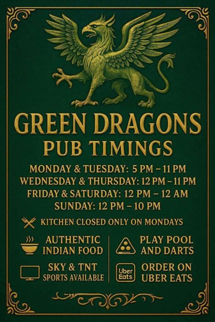 What makes a pub unforgettable? For many, it’s the feeling of walking into a place that feels like home. At The Green Dragon, you’ll find warm lighting, wooden beams, the gentle hum of conversation, and the mouthwatering scent of food from the kitchen.